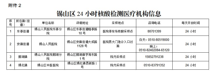 锡山人民医院、锡山区中医医院、锡山人民医院东亭分院、锡山人民医院鹅湖分院采样点为“愿检尽检”人员(因日常出行等需要核酸检测人群)提供核酸采样服务,实行自费采样检测,采样时间均为24小时(见附件2)。【注意:拨打座机电话,需加区号0510】
