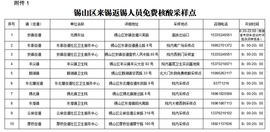 锡山区共设立了10个“应检尽检”(根据疫情传播风险研判,应该进行核酸检测的,要保证必须检测的人员)免费核酸检测采样点,为来锡返锡市民提供免费采样服务,免费采样点采样服务时间为上午8时到晚上20时(见附件1)【注意:拨打座机电话,需加区号0510】