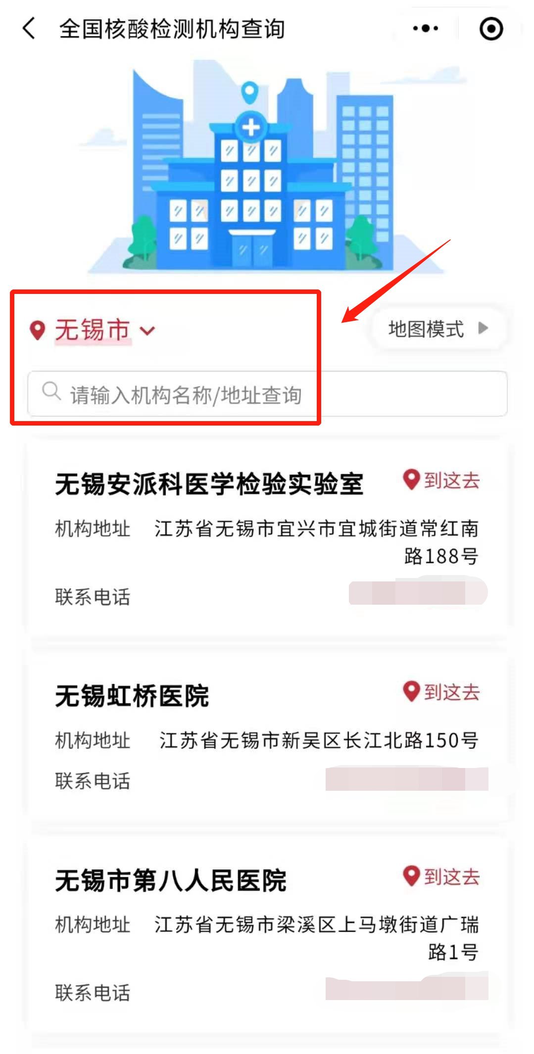 查询机构:进入服务后,选择所在省份及城市(如”江苏省无锡市“,或输入机构名称/地址等关键字,即可显示该区域的核酸检测机构地址及联系方式。通过切换“地图模式”可进入“核酸检测预约地图”进行查看。