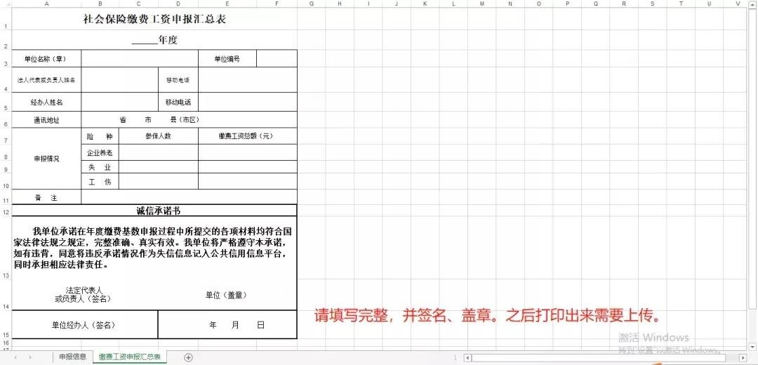 步骤五:填报缴费工资申报汇总表。需要填写完整,并签名、盖章。