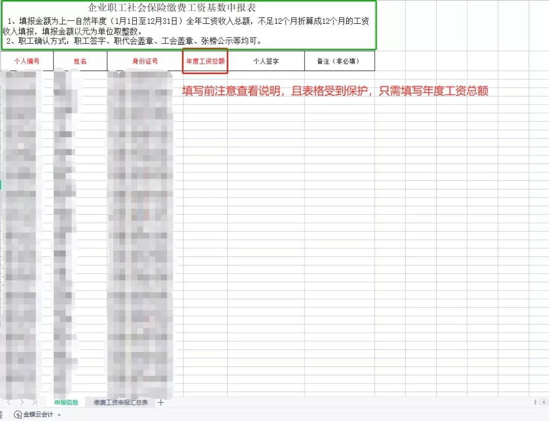 步骤四:填报申报信息表。表格编辑时请注意,表格受到保护,其他信息无法修改。只需填写年度工资总额。
