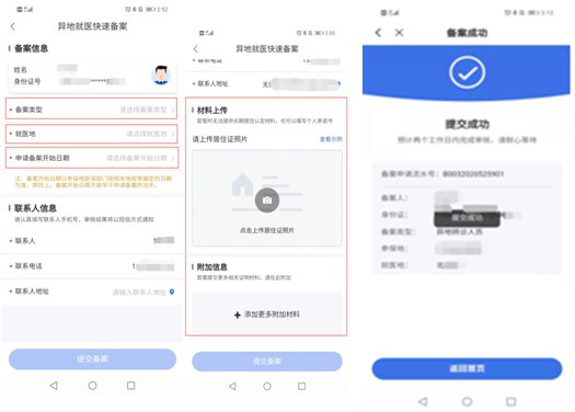 3、填写备案信息和提交备案本材料。选择【备案类型】、【就医地】、【申请备案开始日期(无锡大市备案有效期为6个月)】,提交相关材料,点击【提交备案】,可看到提交结果。
