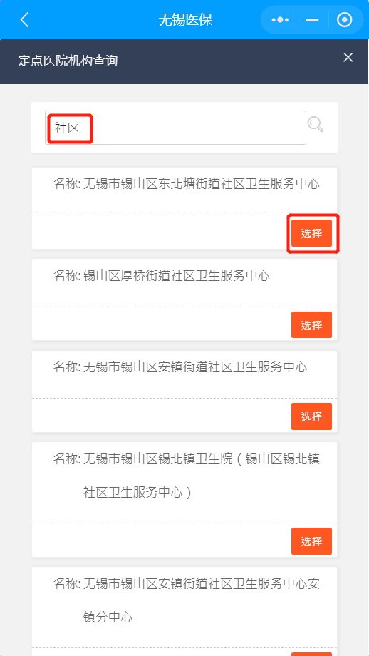 第三步:选择定点医院,根据定点医院名称进行搜索,在列表中选择机构点击“选择”,跳出变更成功提示,即为变更成功,此时查看定点机构为变更后的定点机构,次年可到新定点机构就诊。