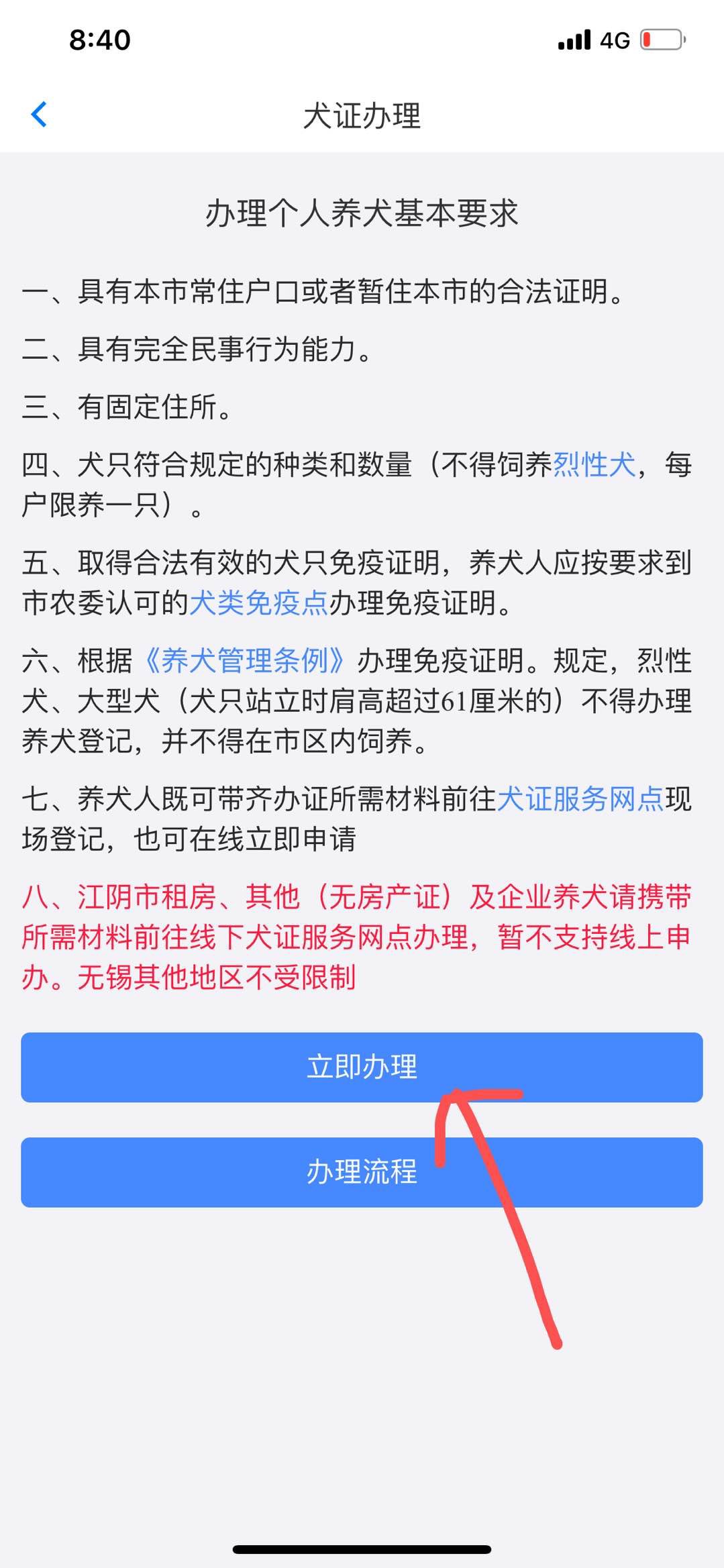 4、选择“立即办理”,按照页面提示完成申请
