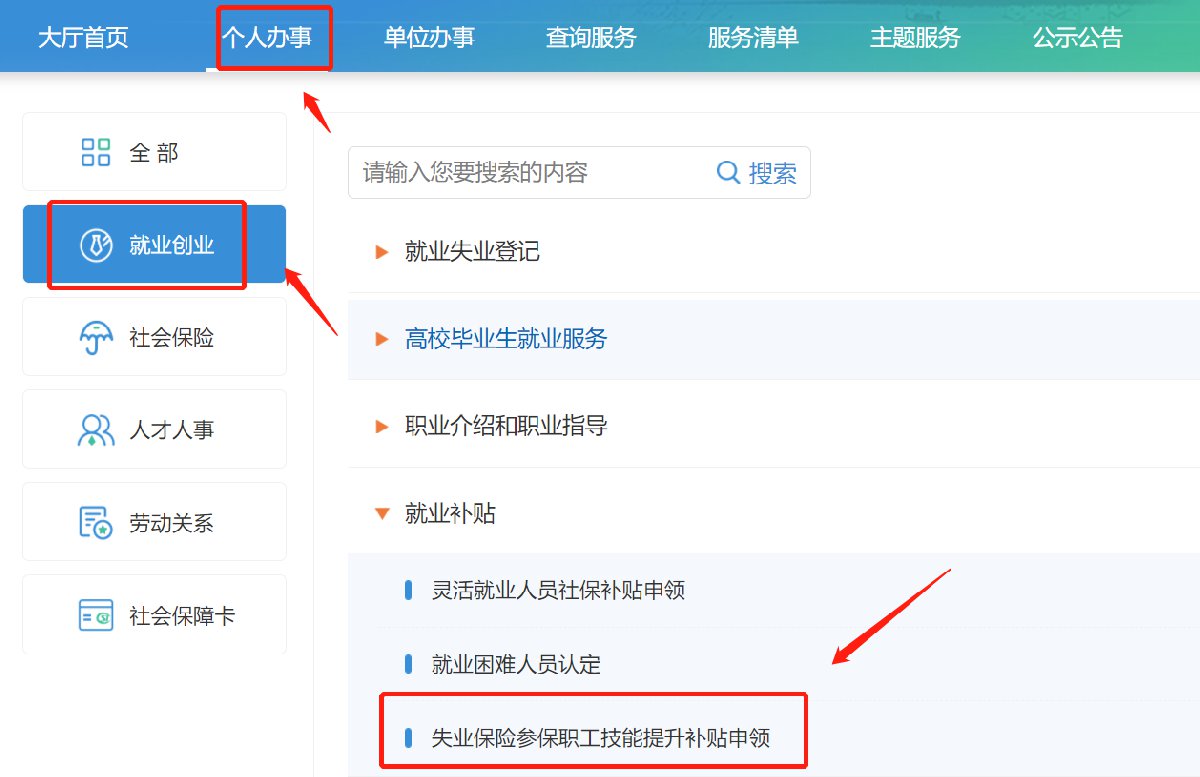 进入系统后,点击【个人办事】-【就业创业】-【失业保险参保职工技能提升补贴申领】