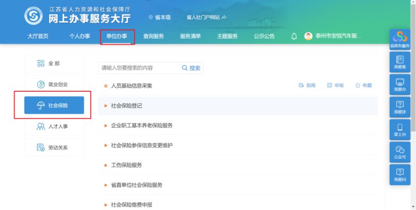 1.点击菜单栏中“单位办事”;点击左侧导航栏目“社会保险”。