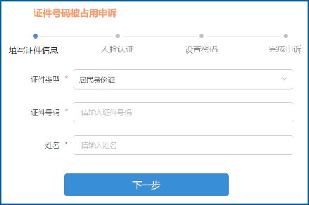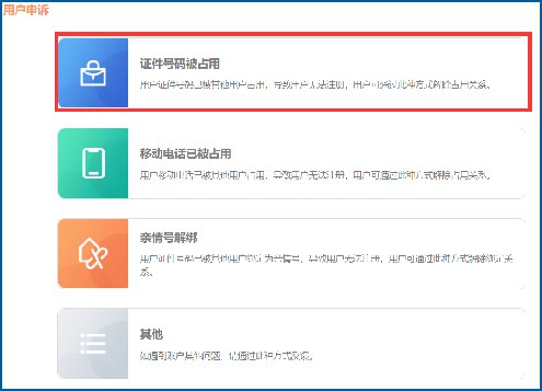 1. 用户进入登录页面,选择“用户申诉”,选择【证件号码被占用】。
