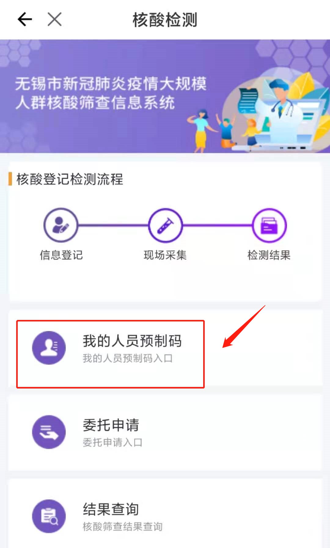 三、进行个人信息登记,登记成功后在核酸检测,现场直接出示个人[人员预制码]即可。