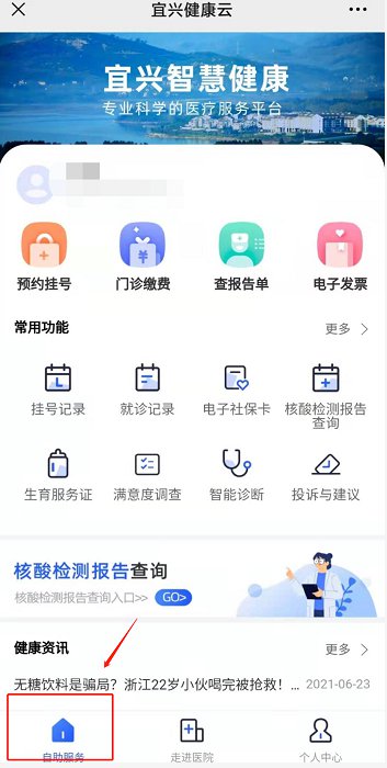 一、微信搜索并关注公众号“宜兴健康云”,点击“智慧医疗”菜单栏