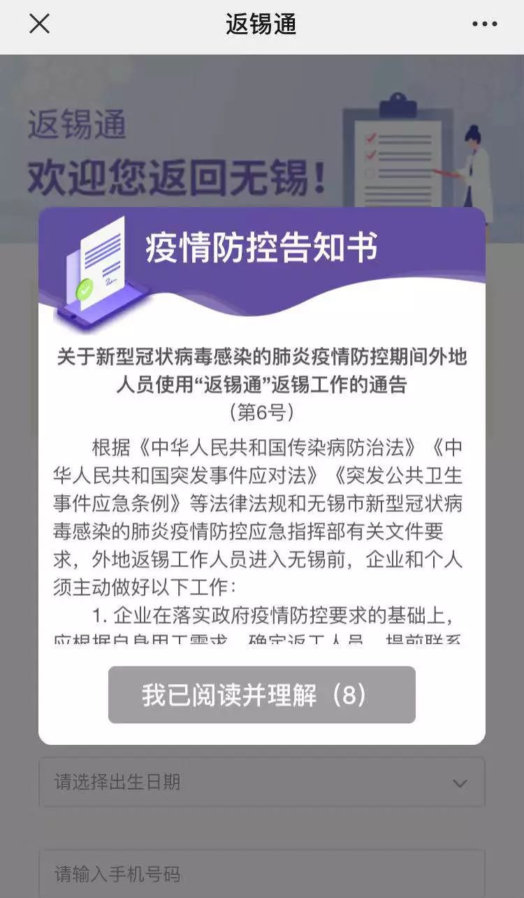 根据无锡《关于新型冠状病毒感染的肺炎疫情防控期间外地人员使用“返锡通”返锡工作的通告(第6号)》