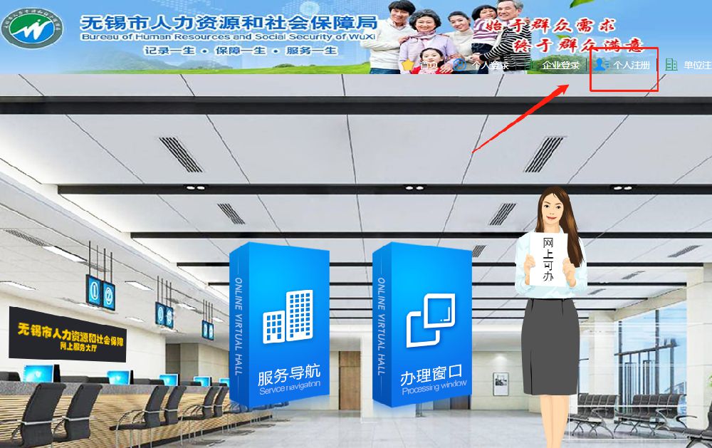 办事大厅入口(http://hrss.wuxi.gov.cn/fzlm/wxsrlzyhshbzwsfwdt/index.shtml)具体页面如下: