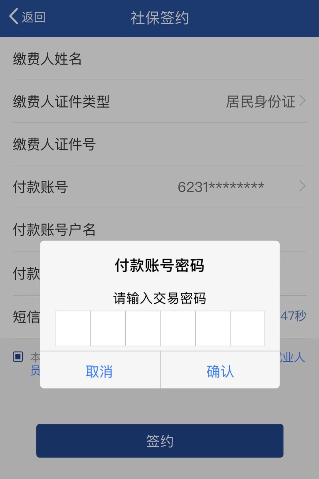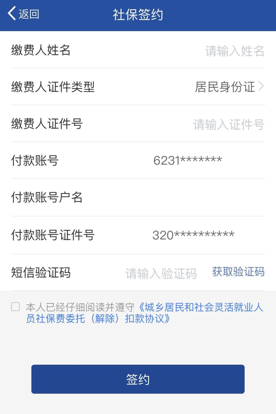 3.进入社保签约界面,输入“姓名”“证件号”,确认个人信息无误后,获取验证码,阅读并勾选“本人已仔细阅读并遵守《城乡居民和社会灵活就业人员社保费委托(解除)扣款协议》”,点击【签约】,系统将要求验证您的银行卡交易密码。