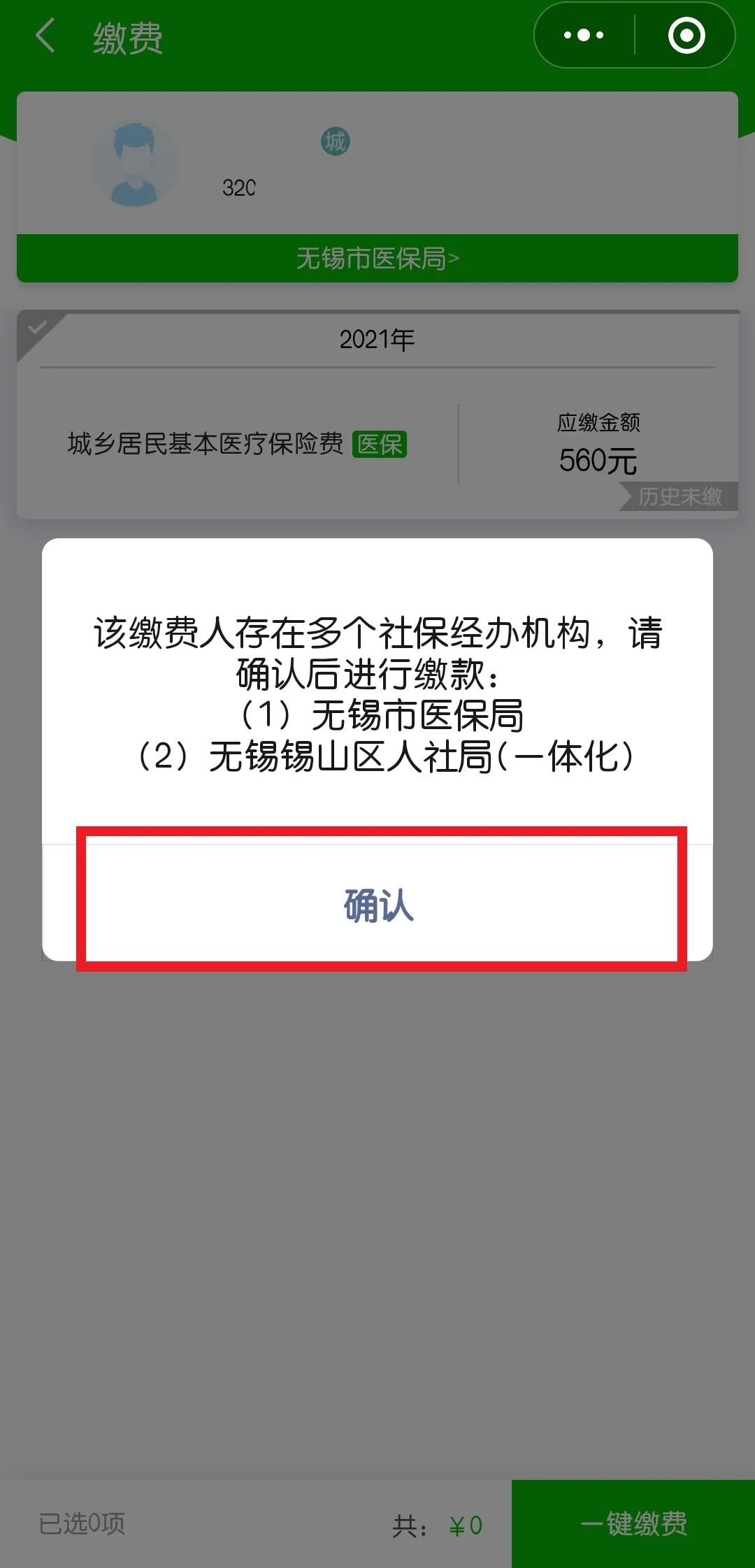 3.选中需缴费人员后,点击查询参保及应缴信息,选择对应的经办机构(城乡居民基本医疗保险对应的经办机构为无锡市医保局)。点击【缴费】或【代人缴费】查询出档次信息及待缴费数据,确认待缴数据,勾选并点击【一键缴费】,支付成功即完成缴费。
