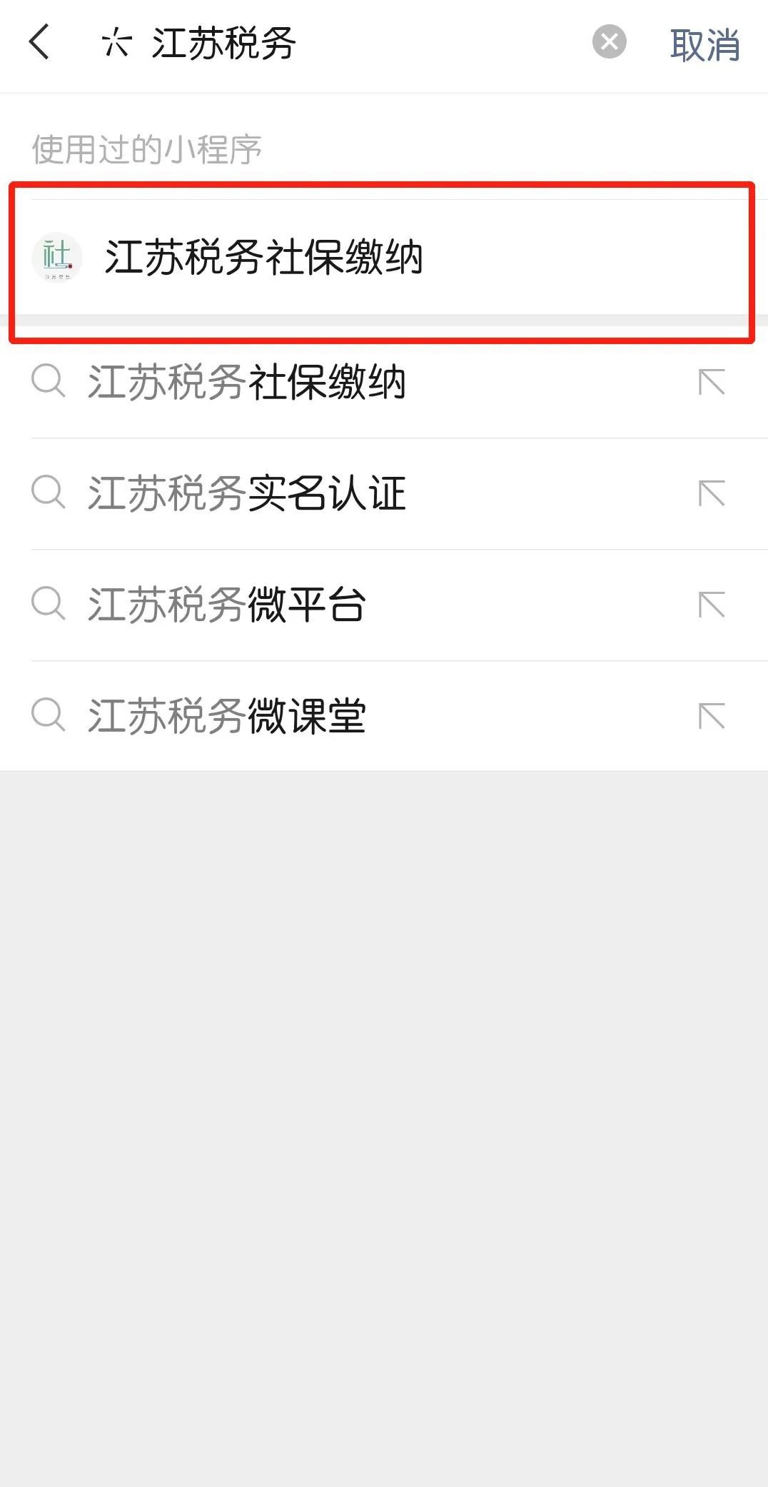 1.关注“江苏税务”微信公众号,进入公众号点击“微办税”,选择“社保缴纳”进入“江苏税务社保缴纳”小程序;或在微信内直接搜索进入“江苏税务社保缴纳”小程序。
