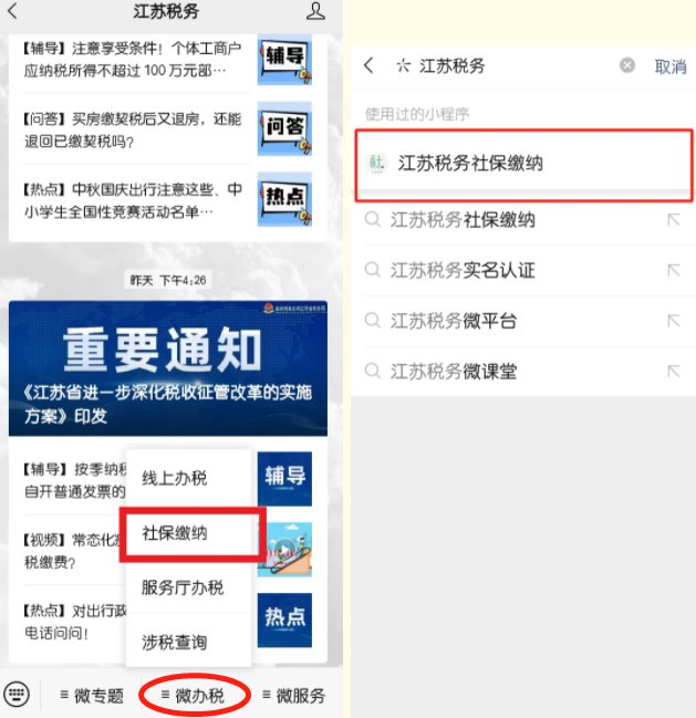 1.关注“江苏税务”微信公众号,进入公众号点击“微办税”,选择“社保缴纳”进入“江苏税务社保缴纳”小程序;或在微信内直接搜索进入“江苏税务社保缴纳”小程序。
