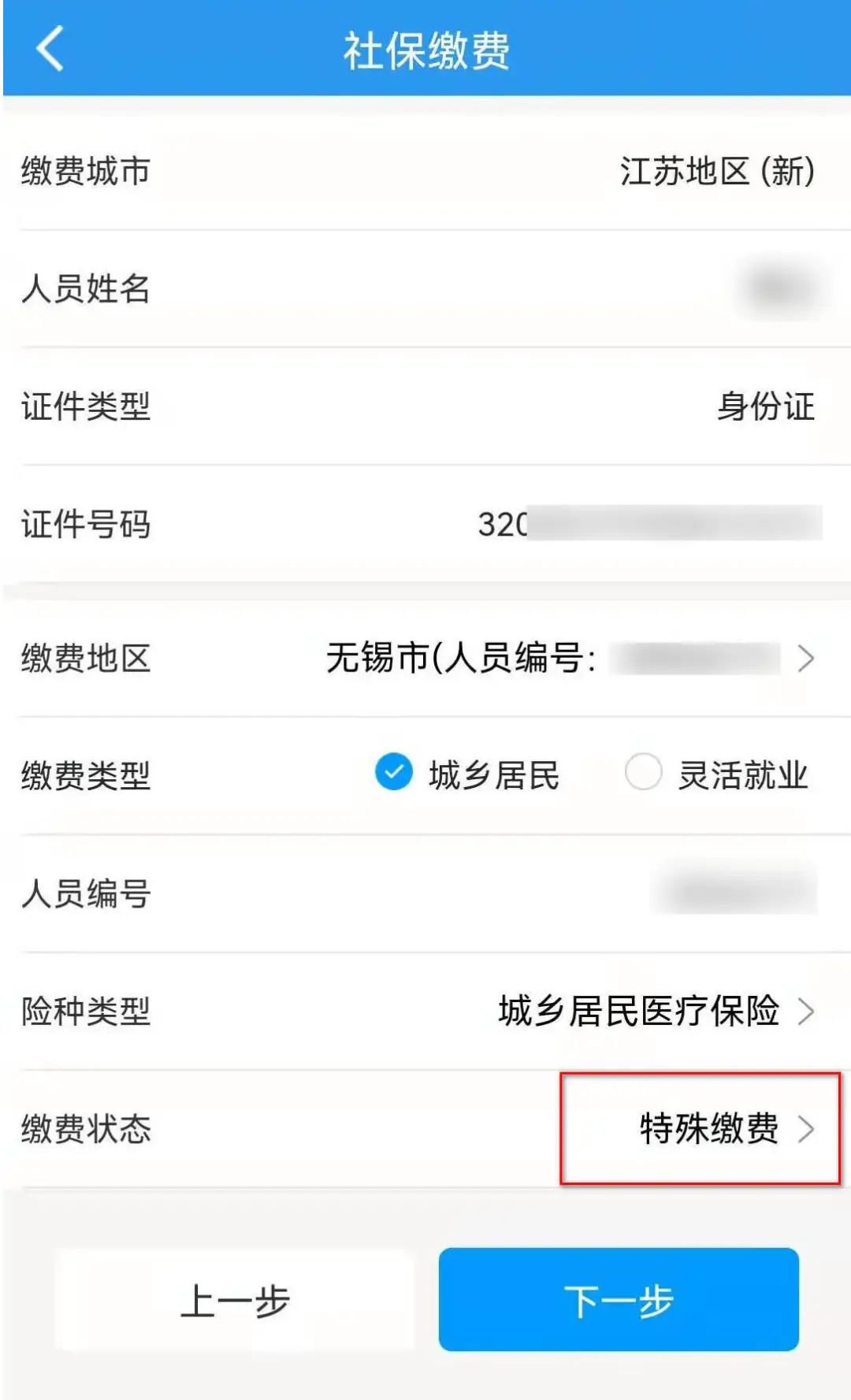 3.江苏银行将显示税务系统反馈的缴费信息,客户选择缴费人员编号(医疗保险费代码为8位)、 “缴费类型”(城乡居民)、“险种类型”(城乡居民基本医疗保险)、“缴费状态”(特殊缴费)等要素后,点击“下一步”进行社保费用的缴纳扣除。