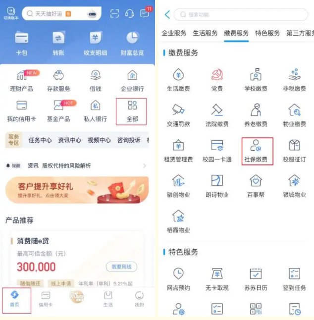 1.打开江苏银行手机银行,选择【缴费服务】→【社保缴费】。
