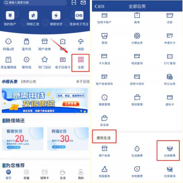 1.登录无锡农村商业银行手机银行,点击【全部】模块下的【便民生活】→【社保缴费】。