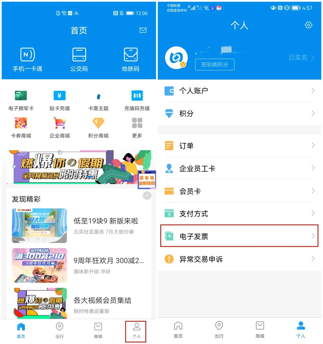 通过“北京一卡通APP”或线下渠道为电子拥军卡进行充值后,次日可在“北京一卡通APP”→“个人”→“电子发票”中提交开票申请。申领时间为充值次日起180个自然日内。