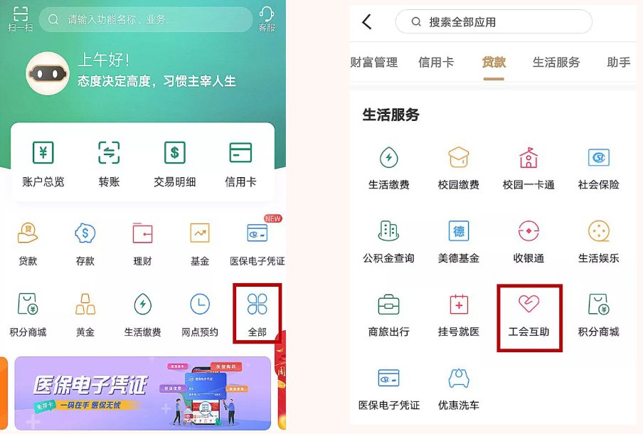 1. 注册登陆手机银行,在首页点击全部——生活服务栏目的“工会互助”。