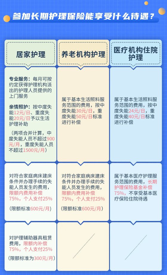(2)医疗护理:属于基本医疗护理服务范围的费用,长期护理保险基金补偿75%,不享受基本医疗保险住院待遇。