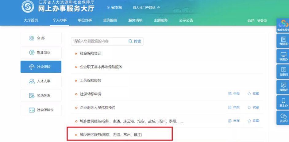 第二步:登录网站之后,点击“个人办事”,点击左侧的“社会保险”按钮,对应右侧会出现社会保险事项,选择城乡居民服务(南京、无锡、常州、镇江)。