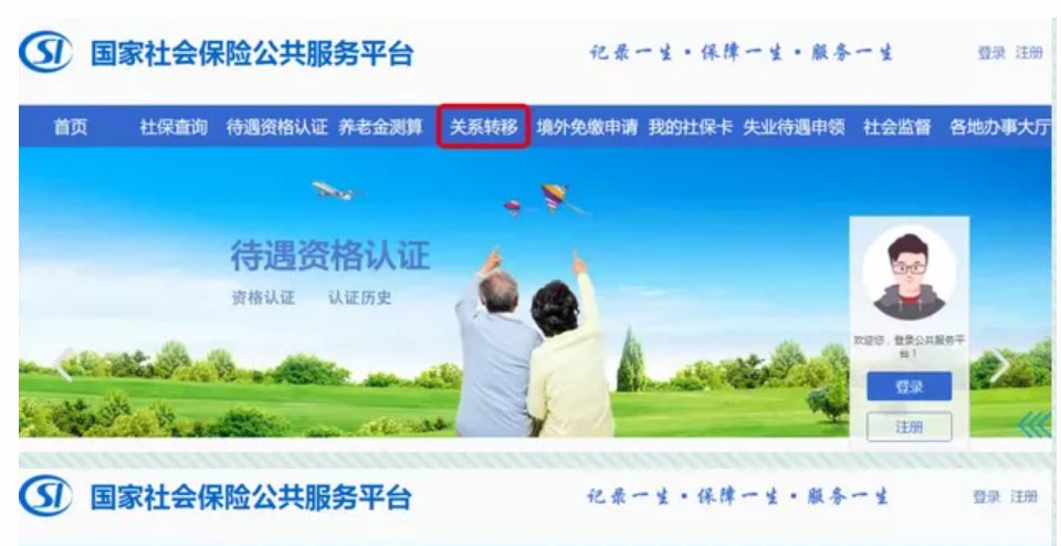 进入国家社会保险公共服务平台,个人登录后,在首页中,选择进入“关系转移”栏目