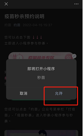 第三步:进入文章后,点击中间的“疫苗秒杀专区”;