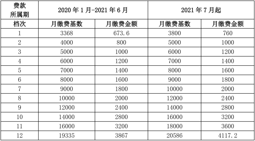 2020年1月至2021年6月,缴费基数为3368元。2021年7月起,缴费基数调整为3800元。