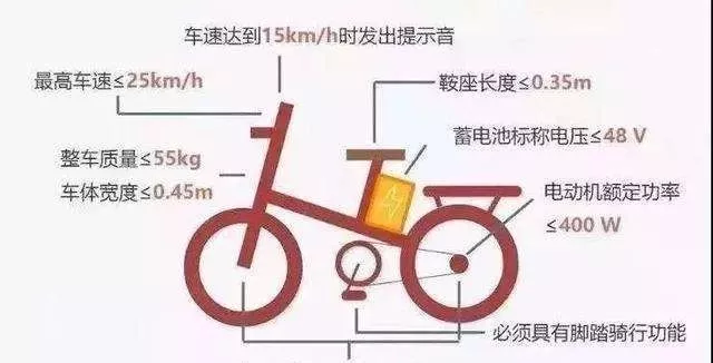 新修订的标准增加了防篡改、防火性能、阻燃性能、充电器保护等技术要求,规定电动自行车须具有脚踏骑行能力、最高设计车速不超过25Km/H、整车质量(含电池)不超过55Kg、电机功率不超过400W、蓄电池标称电压不超过48V。
