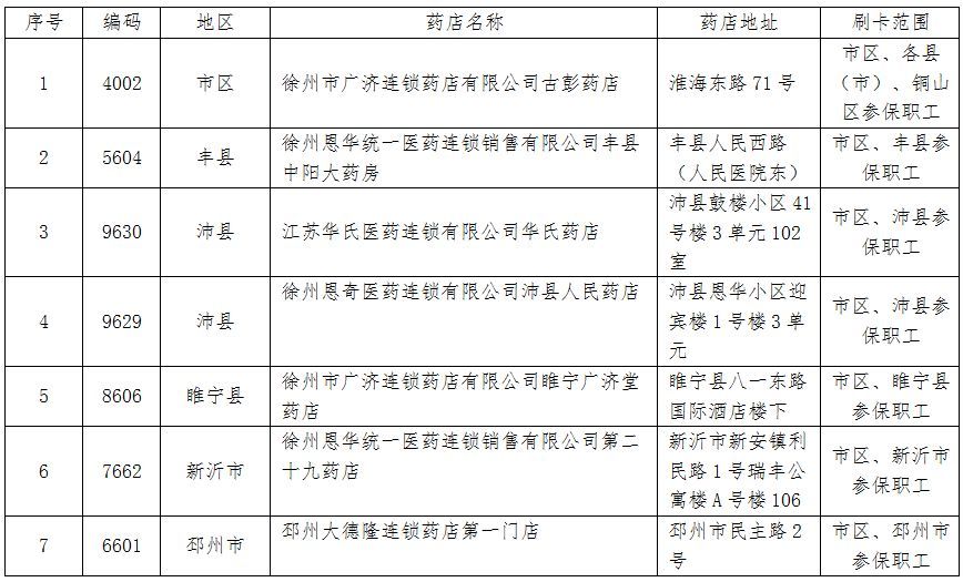 7 | 4022 | 沛县 | 徐州市广济连锁药店有限公司同乐药店 | 沛县大屯矿区工商商贸综合楼一楼103房 | 市区、沛县参保职工 |
