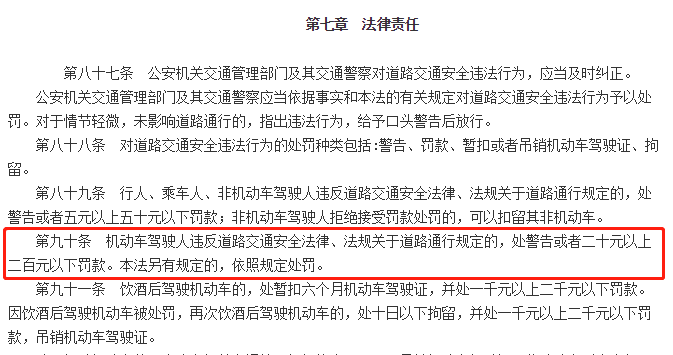 机动车驾驶人违反道路交通安全法律、法规关于道路通行规定的,处警告或者二十元以上二百元以下罚款。本法另有规定的,依照规定处罚。