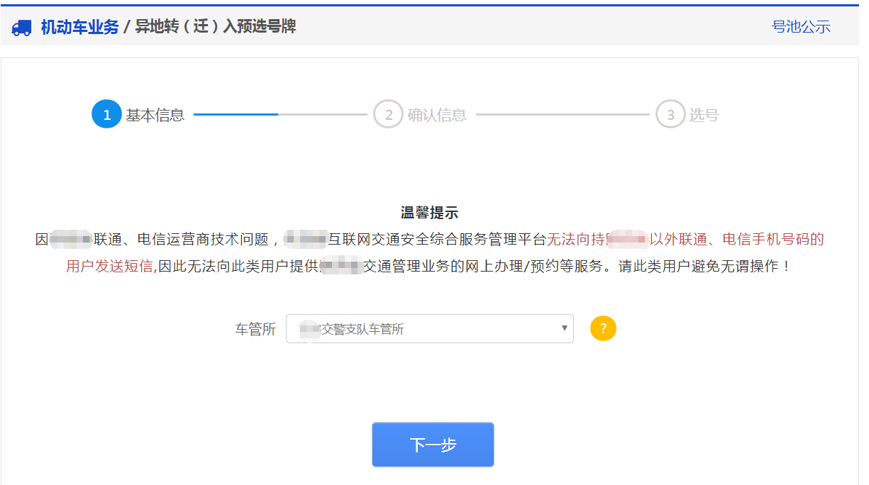 用户首次进入该功能,系统将显示预选号牌服务说明页面,点击页面中【提交信息】按钮,进入第一阶段【基本信息】步骤,应选择本人或本单位办理异地转(迁)入业务的车管所,如下图所示。