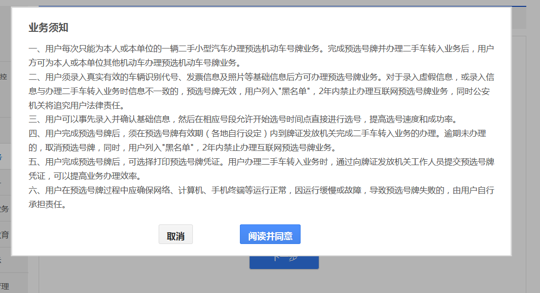点击上图中的【下一步】按钮时,系统会弹出业务须知的对话框,界面如下图所示,业务须知具体内容由各地自行维护,下图只是示例,不代表本平台选号的业务须知内容。 请用户在预选号牌时务必仔细阅读业务须知,了解业务相关规则。用户点击对话框中的【阅读并同意】按钮进入第一阶段步骤2【确认信息】步骤。