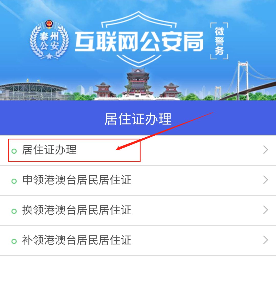 第一步:进入泰州公安微警务首页,点击【户政服务】—【居住证办理】