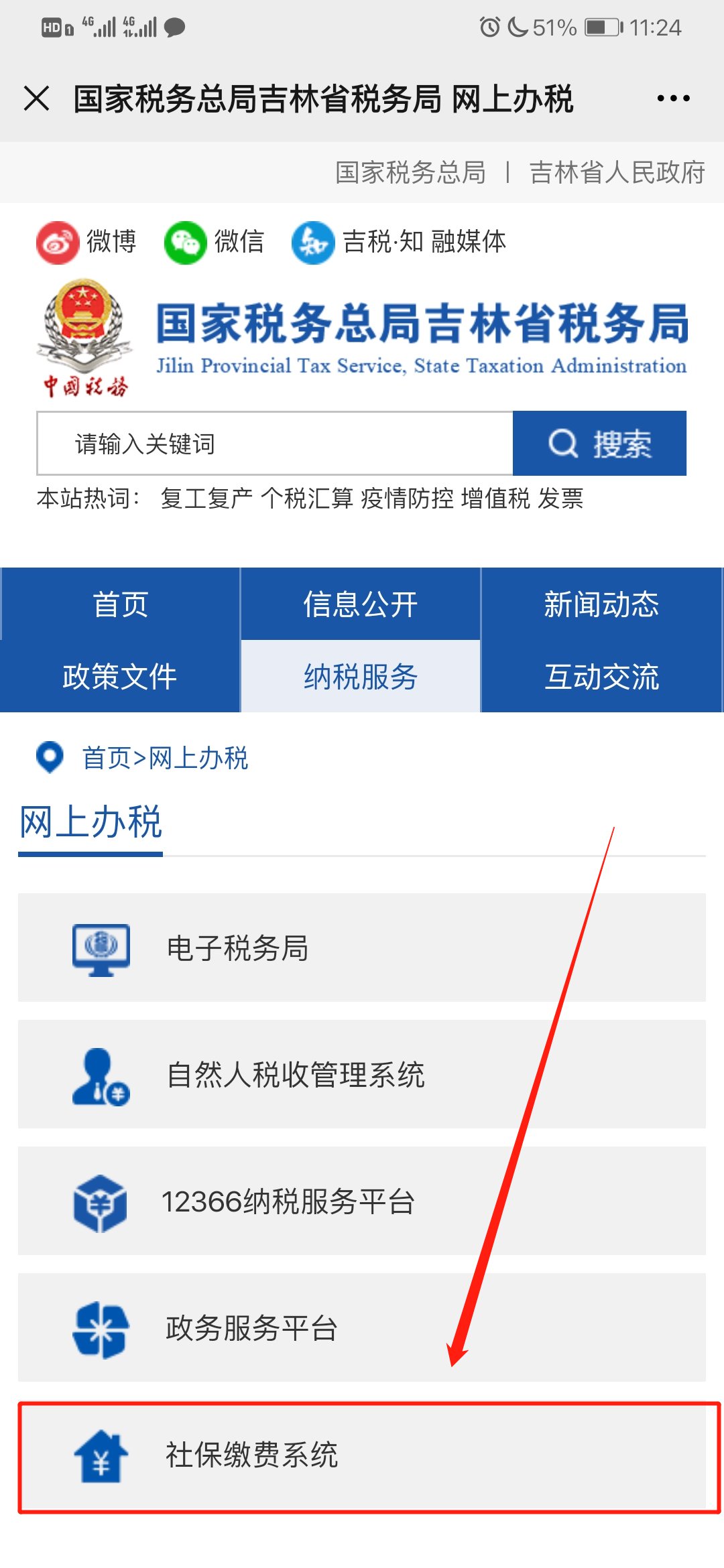 2.进入公众号后,点击菜单栏中的“微办税”选择“网上办税”,并在弹出网页中点击“社保缴费系统”即可进入长春社保网上缴费平台;