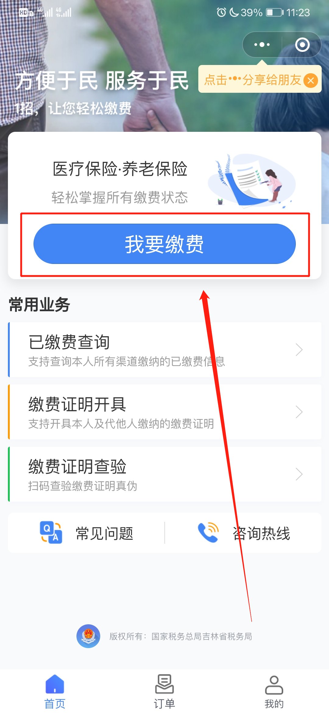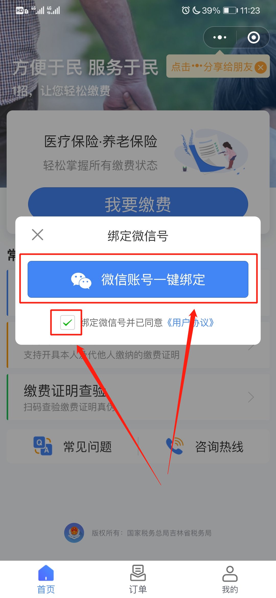 3.长按扫描网页中的二维码,在跳转网页中点击“我要缴费”,并进行微信、手机号绑定;