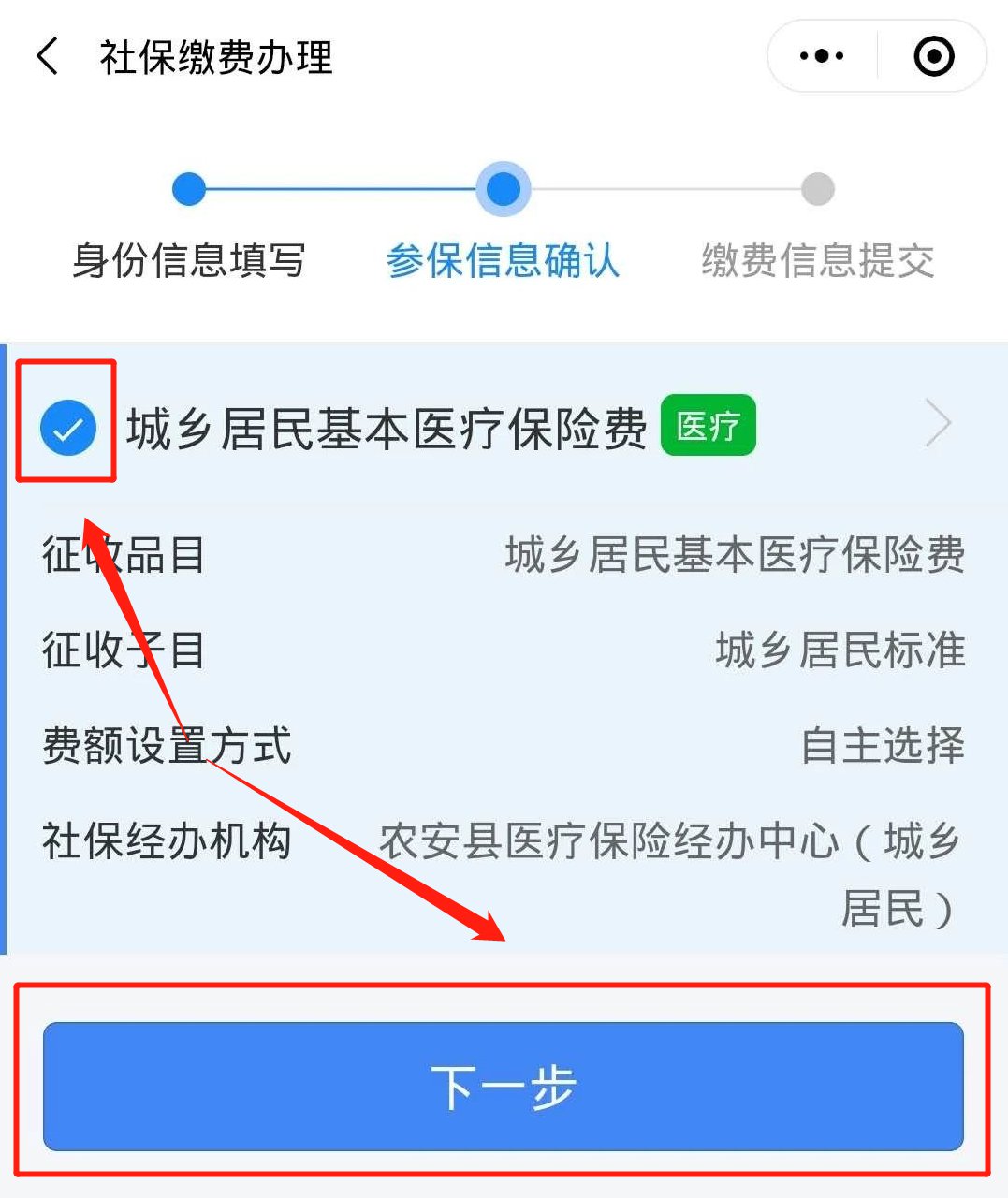 5.选择医疗保险并点击下一步,进行缴费即可。