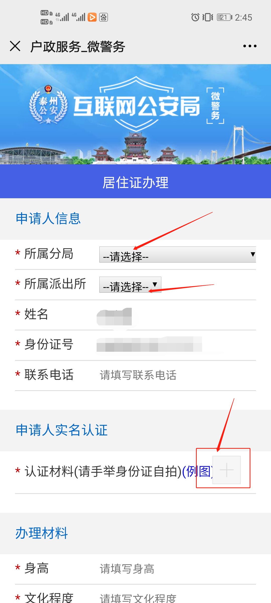 第三步:选择所在地的派出所分局(办理成功后需要到申领派出所领取),上传申请人认证材料