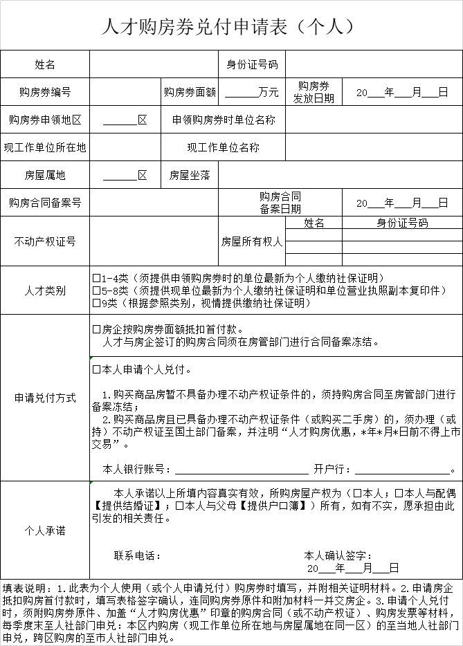 2、填写并本人签字《人才购房券兑付申请表(个人)》;