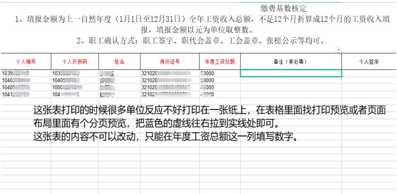 三、打开模板后里面有两张表格,看下左下角,一个表格是申报信息,另一个表是缴费工资申报汇总表。电脑端只需要填写第一个表申报信息里面每个员工的年度工资总额,填写好之后不要忘记保存。年度工资总额指的是该员工2021年1-12月的全年工资收入总额,不足12个月的请折算成12个月填写,如该员工2021在单位工作了7个月,7个月工资总额为35000元,先用35000÷7=5000,即为该员工的月平均工资,年度工资总额需要用5000×12=60000,以60000填写。系统会自动识别单位填写的该员工年度工资总额的数字÷12,以元为单位取整数作为该员工2022年1-12月的月缴费基数。