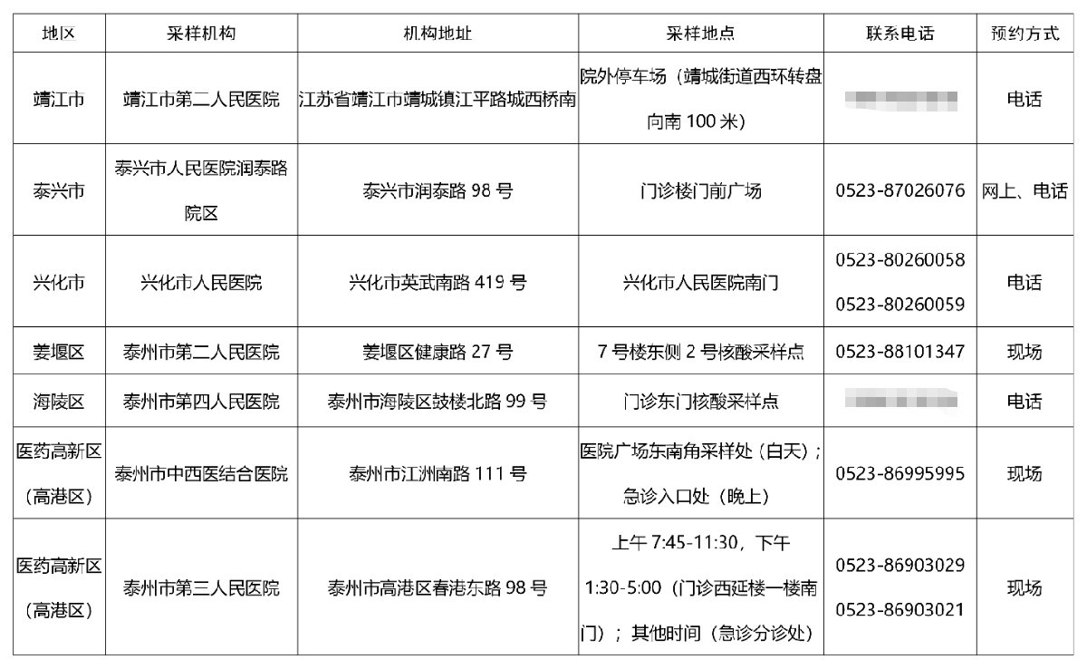 泰州市核酸检测核酸机构汇总一览表: