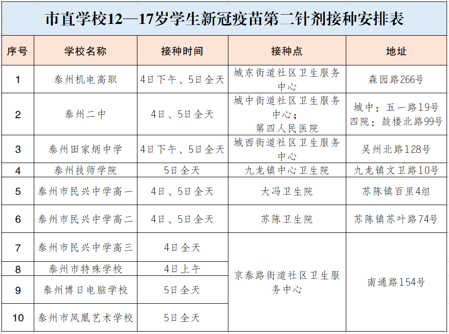 2021年9月4日、5日、11日、12日这几天,泰州海陵区将安排辖区内市直、区属学校学生按指定时间,到指定接种点,由学校以班级为单位组织12-17岁人群接种新冠疫苗第二针。