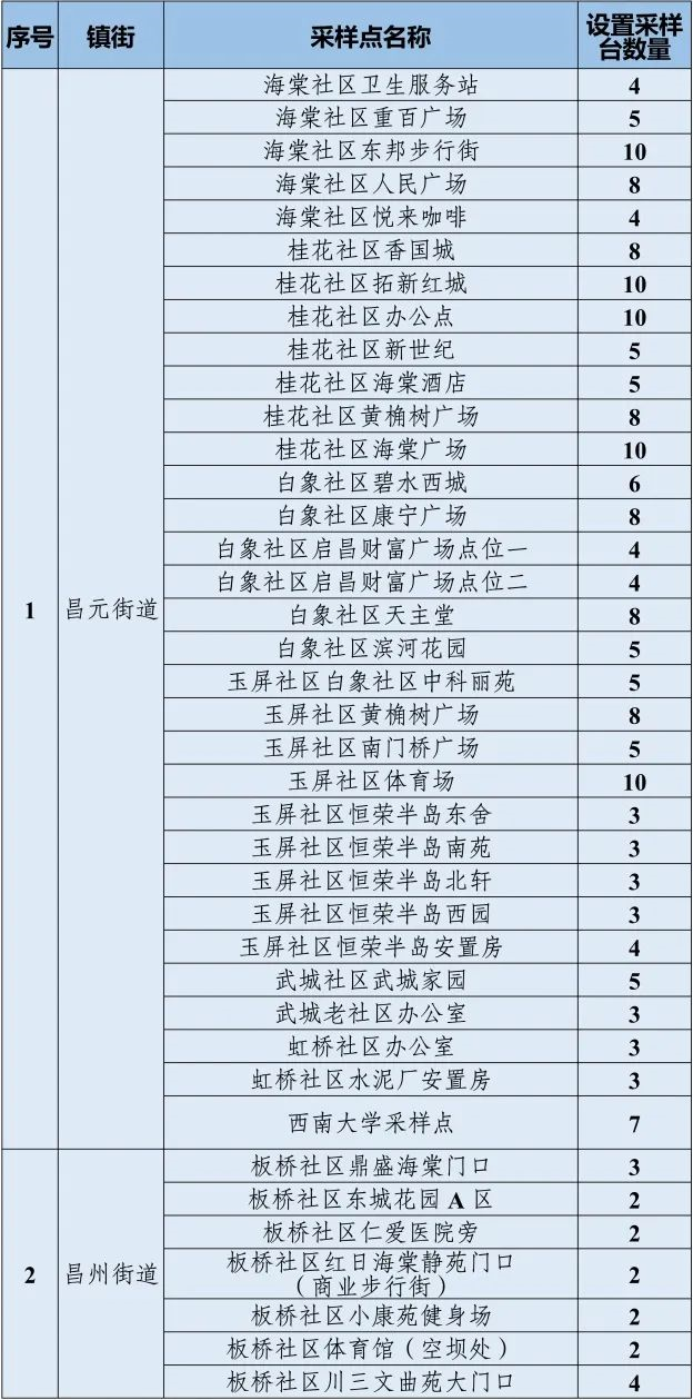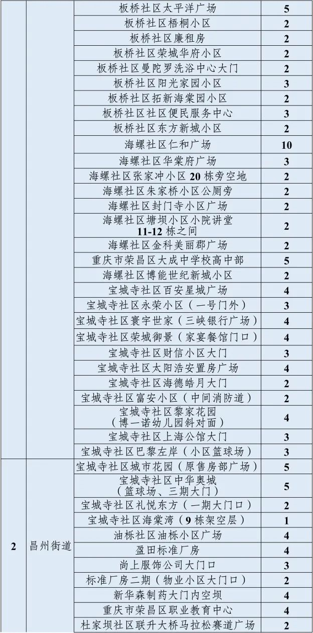荣昌区部分区域社会面核酸筛查采样点和采样台设置情况