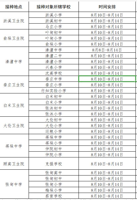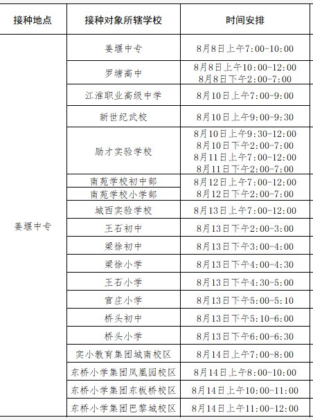 12-17岁学生新冠病毒疫苗姜堰中专、实验初中等2个城区接种点,由于8月10日-11日罗塘街道全员核酸检测,为便于组织,将8月10日的接种时间调整至8月15日,8月11日的接种时间调整至8月16日,其他不变。敬请理解支持。