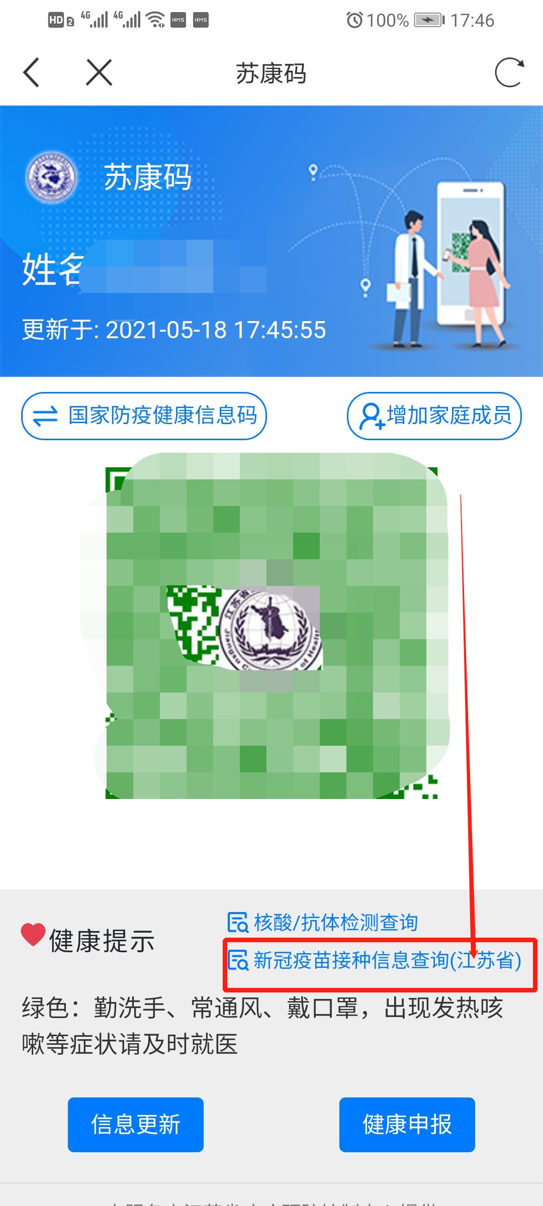 第二步:申报后,将获得相应颜色的“苏康码”标识,再次点击进入即可查看健康码二维码的状态。在下方点击“新冠疫苗接种信息查询(江苏省)”即可进入获取新冠疫苗接种信息。