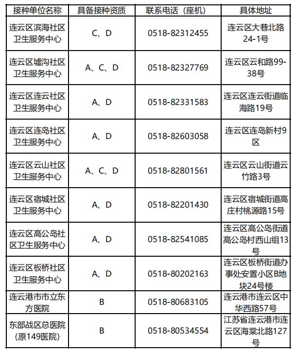 连云区预防接种门诊信息一览表