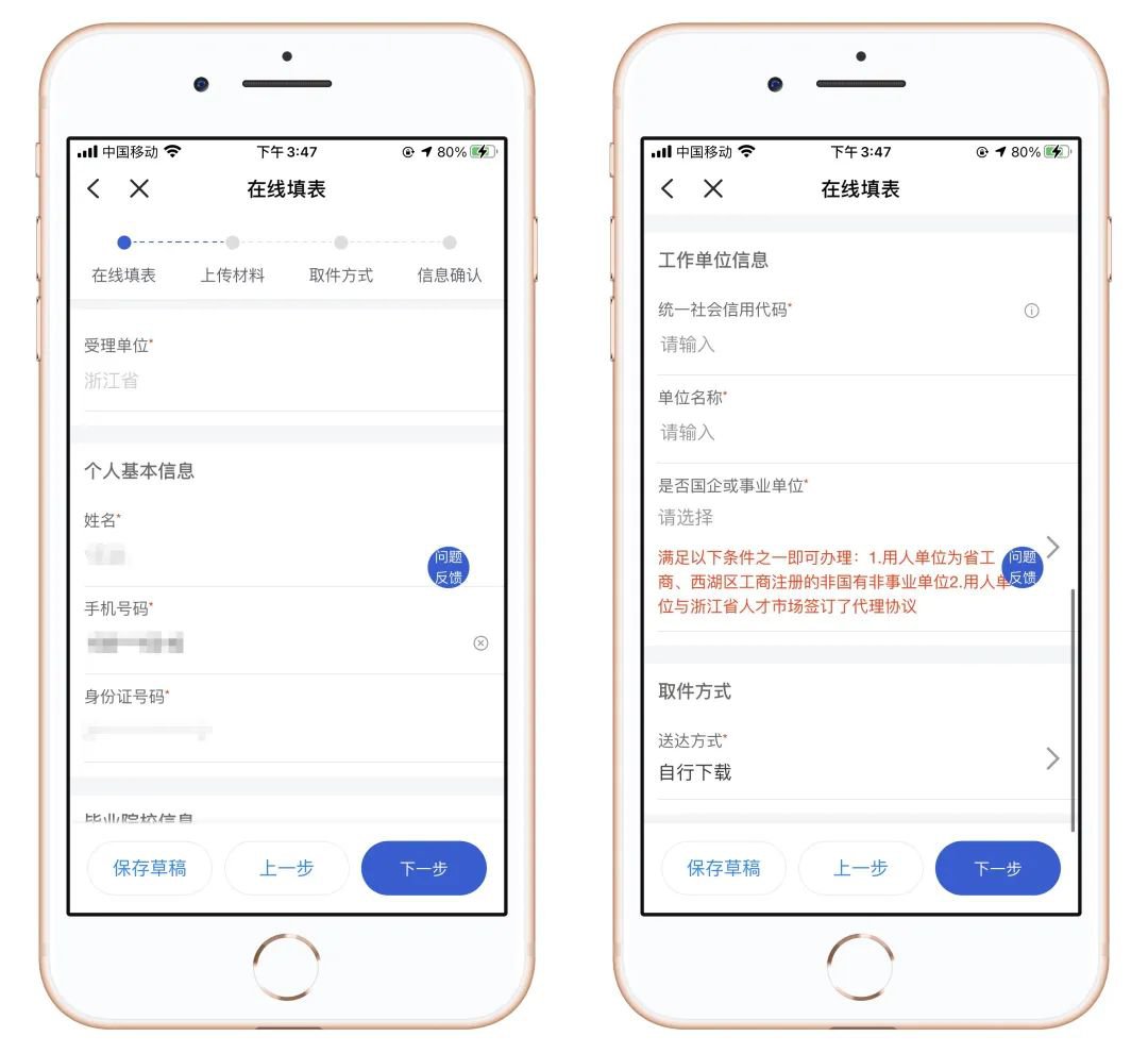 完成在线填表(包含个人基本信息、工作单位信息、取件方式等)