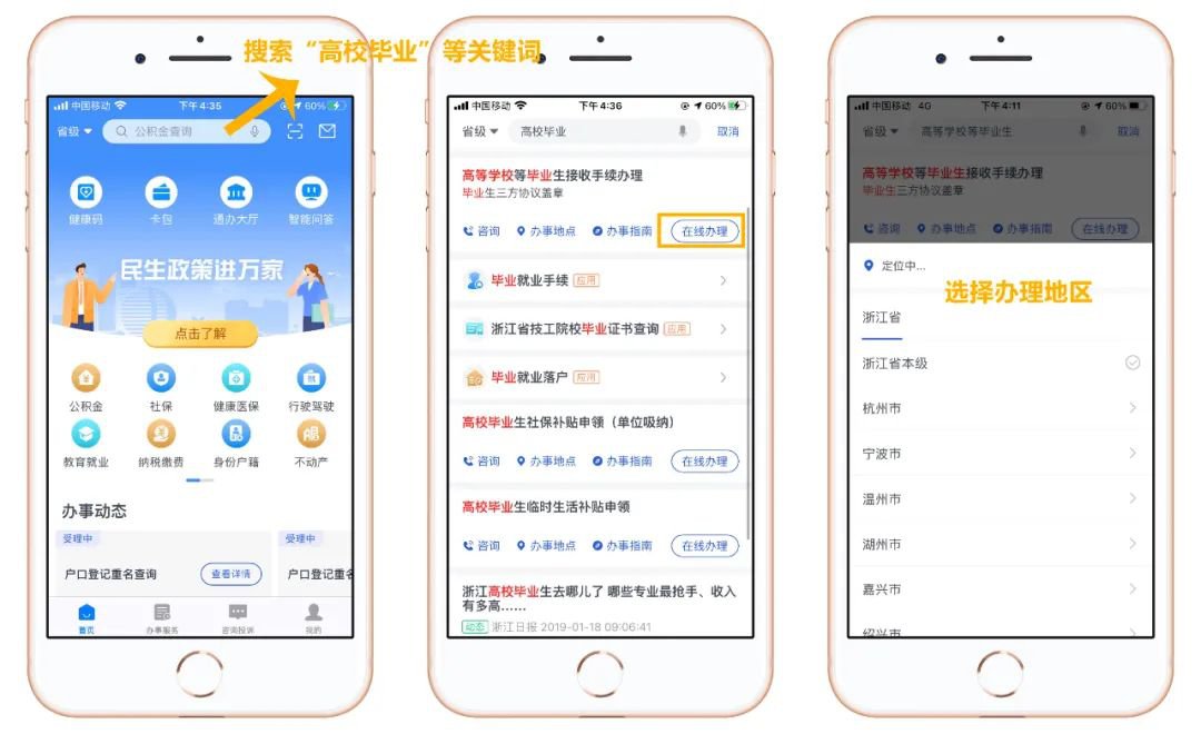 搜索“高校毕业”等关键词,选择“在线办理”,选择办理地区。