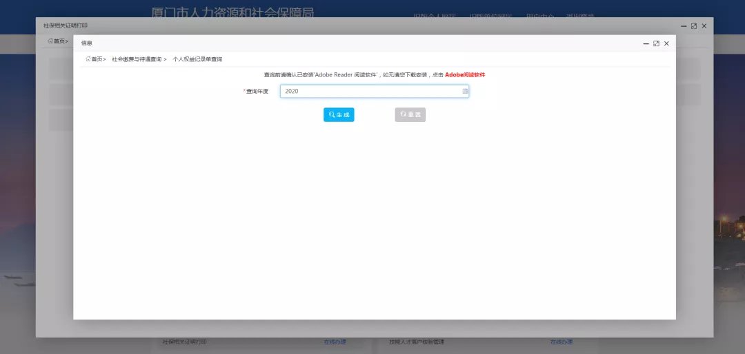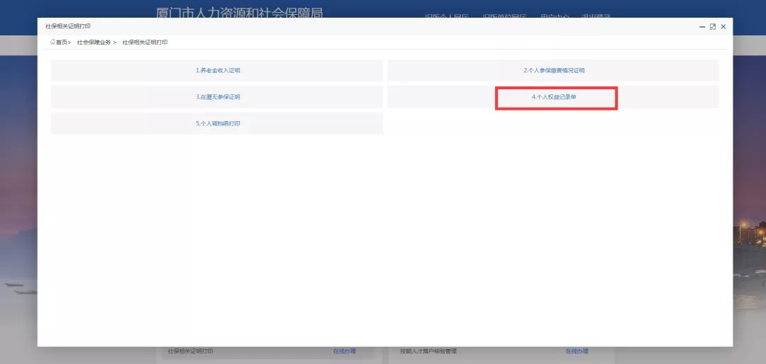 进入个人网上办事大厅以后,点击“个人办事”-“社保相关证明打印”-“个人权益记录单”,根据操作引导即可获取。